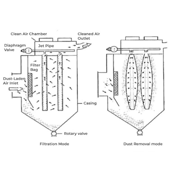 يعمل مجمع الغبار الخاص بمرشح الأكياس عن طريق دفع الهواء أو الغاز عبر أكياس المرشح، مما يحبس جزيئات الغبار. يمر الهواء النظيف عبر الأكياس بينما يتراكم الغبار على السطح الخارجي للنسيج، والذي يتم تنظيفه بشكل دوري باستخدام الهواء المضغوط.